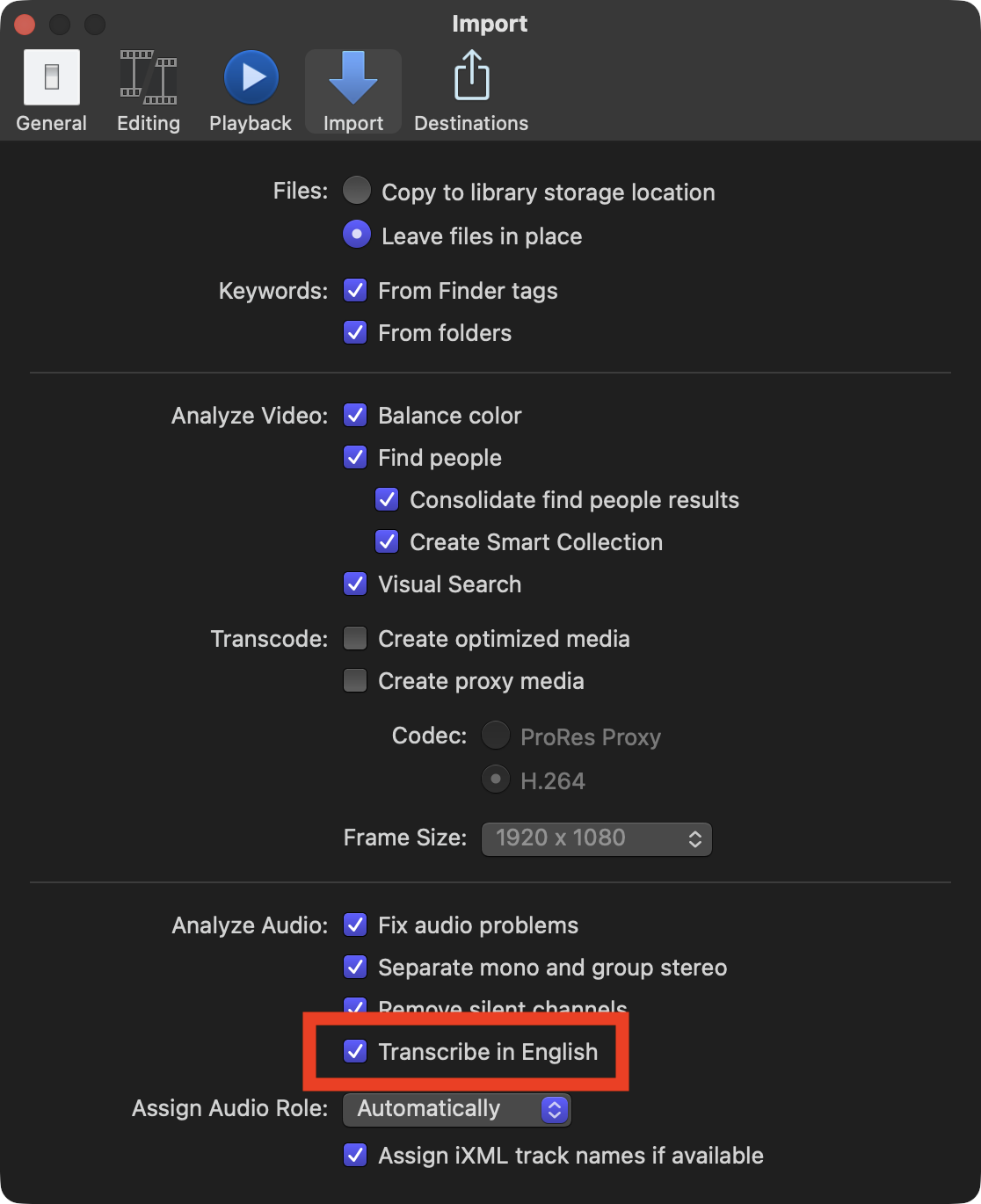 By default in Final Cut Pro v12 (lifetime/perpetual) and Final Cut Pro Creator Studio v12 (subscription), Transcribe in English is enabled by default.