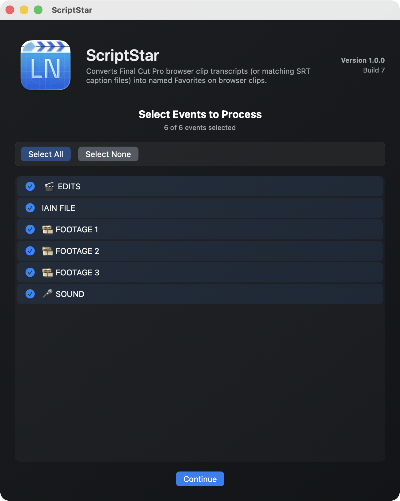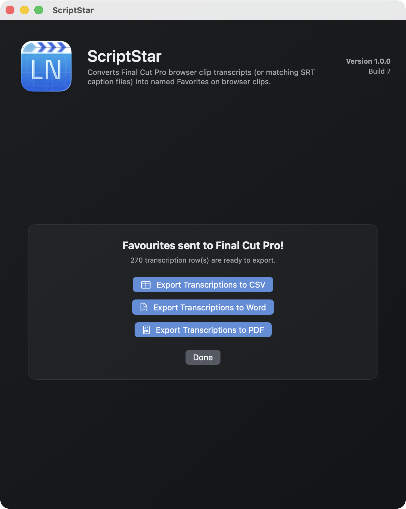 You can launch ScriptStar from both your /Applications folder, and via the Final Cut Pro Workflow Extensions button in the toolbar and menubar.