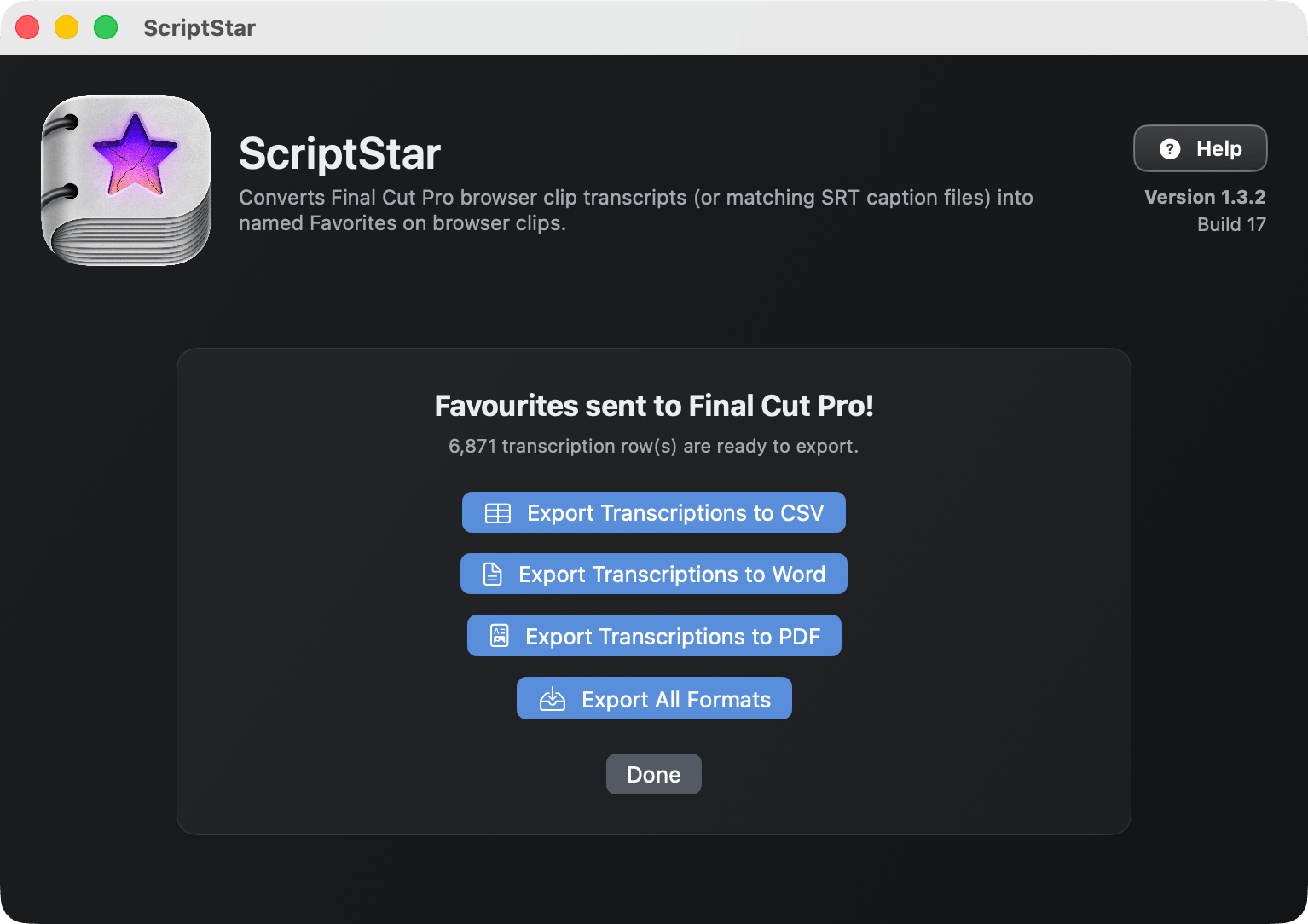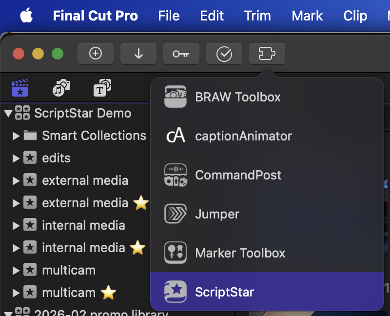 With clips transcribed, you can now launch ScriptStar from either your /Applications folder, or via the Final Cut Pro Workflow Extensions button in the toolbar and menubar.