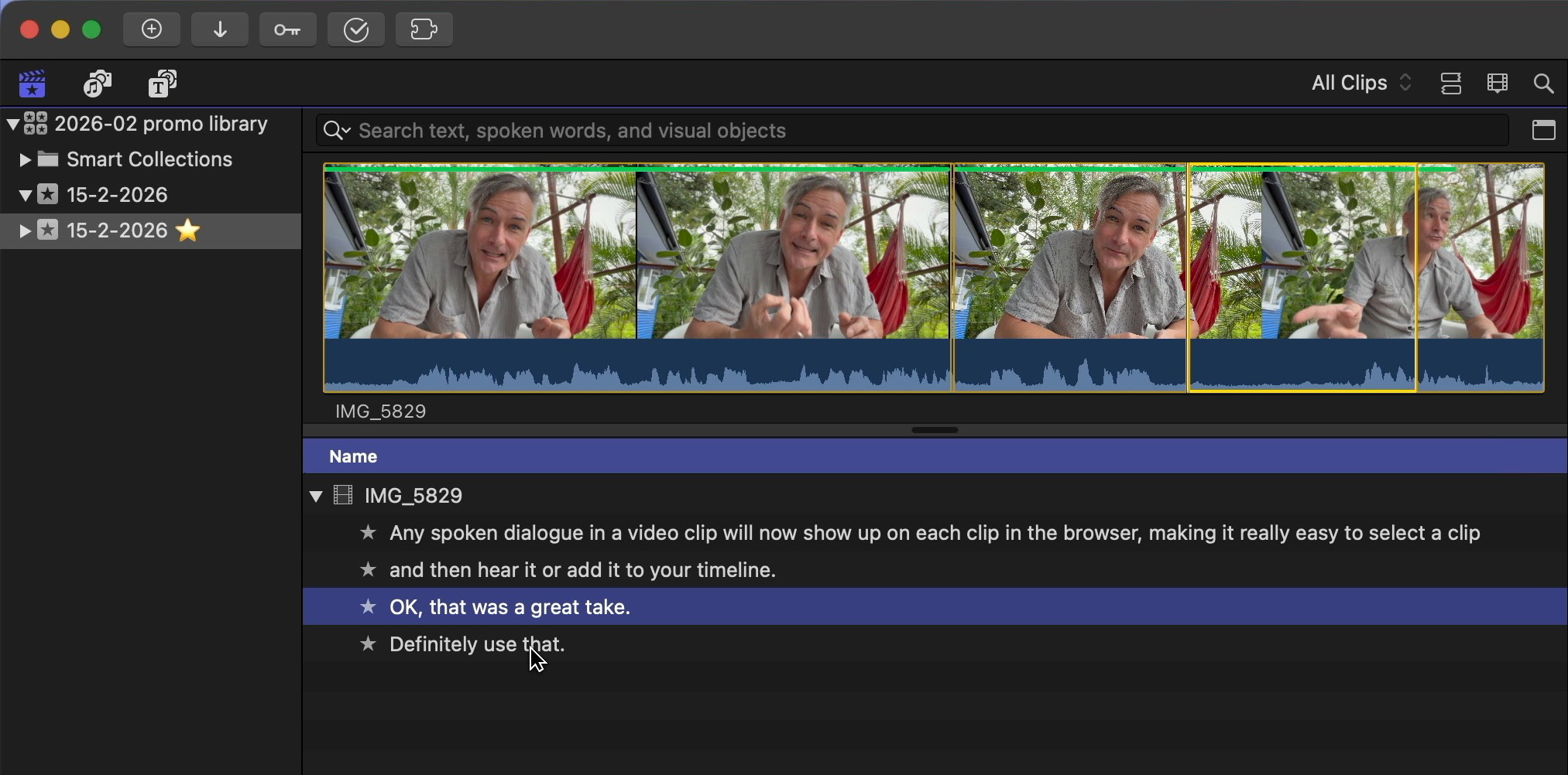 Back in Final Cut Pro, look for the events with the ⭐️ in the name, and twirl each clip’s disclosure triangle to see every line of transcribed dialogue.