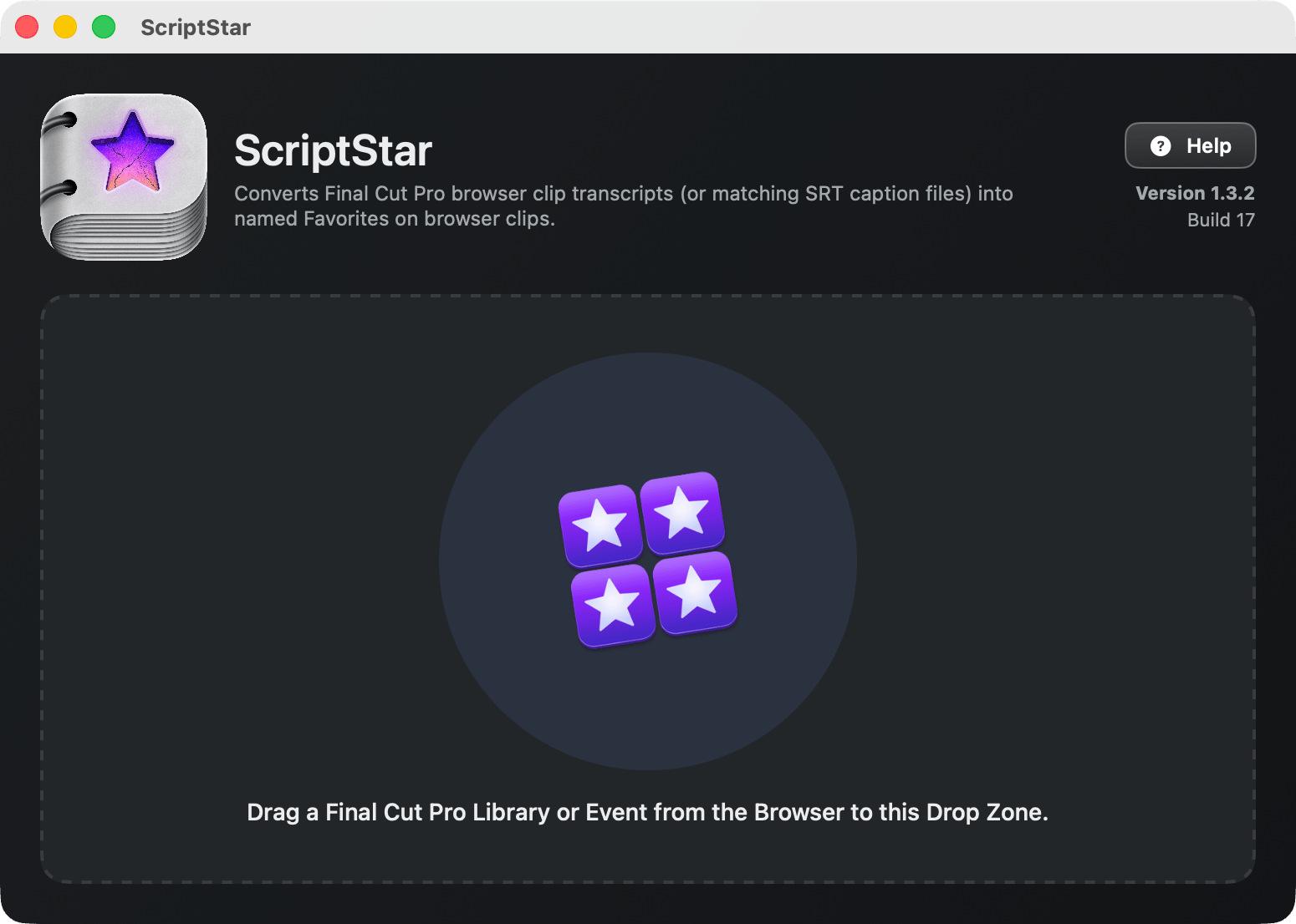 Once launched, simply drag your Final Cut Pro Library or one or more Final Cut Pro Events from the Final Cut Pro Browser interface into the drop zone in ScriptStar to get started.