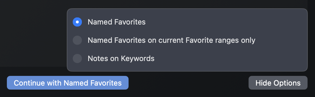 Named Favorites is the default, and will follow the workflow outlined above, placing transcripts onto Named Favorites, and existing Favorites onto the Favorites ⭐️ keyword.